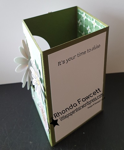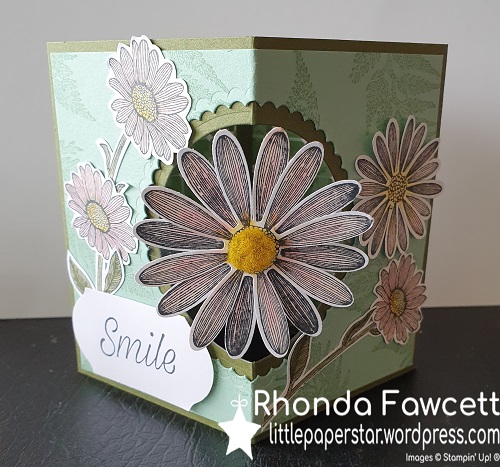 It folds flat for posting and when it stands up the big daisy in the middle pops out and looks like it is floating.