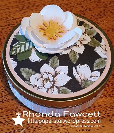 I used an empty sweet tin and covered it with the pretty Magnolia Lane Designer Series Paper. I made a little flower using the Magnolia Memory dies to go on top. The flower has a tiny bit of Petal Pink sponging in the middle. Very simple but very elegant.