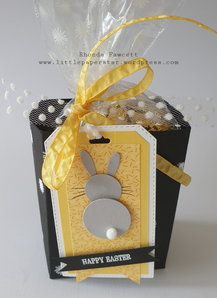 I made this Easter gift using the lovely soft cellophane bags from Stampin’ Up! They are nice and tall (22.9cm) and are pre printed with white stars. They would easily hold seven of the marshmallow eggs that we get in New Zealand, however I have only put five in my bag.