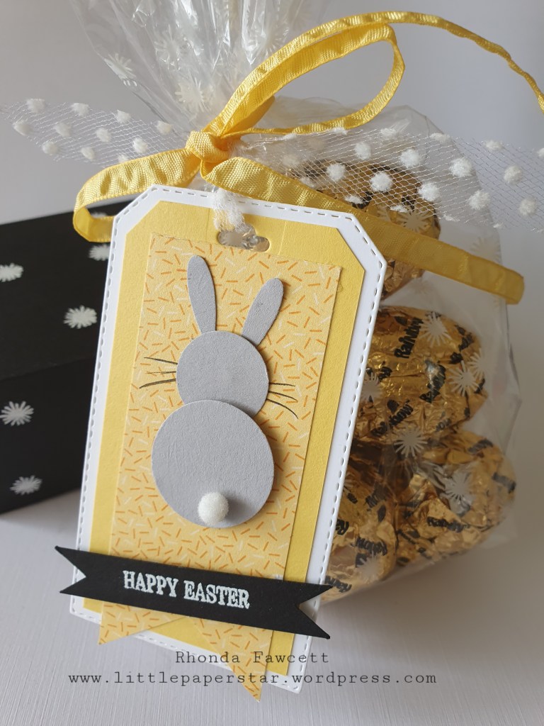 The tag is from the bonanza dies. The bunny uses a 1 ” circle punch, a 3/4″ circle punch and the small daisy punch for the ears. The tail is a pompom from the birthday bonanza suite.