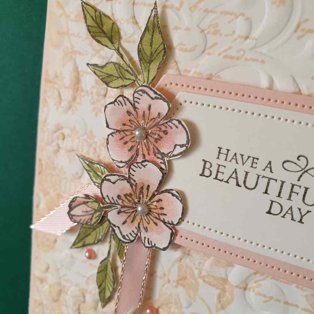 This pretty card was given to me by Sheryl Wanhill. I just love how she did the background. It looks simple but she has stamped and sponged it and then put it through the embossing folder. It creates a lot of texture and interest without overpowering the card. Here are the products she used to make it.