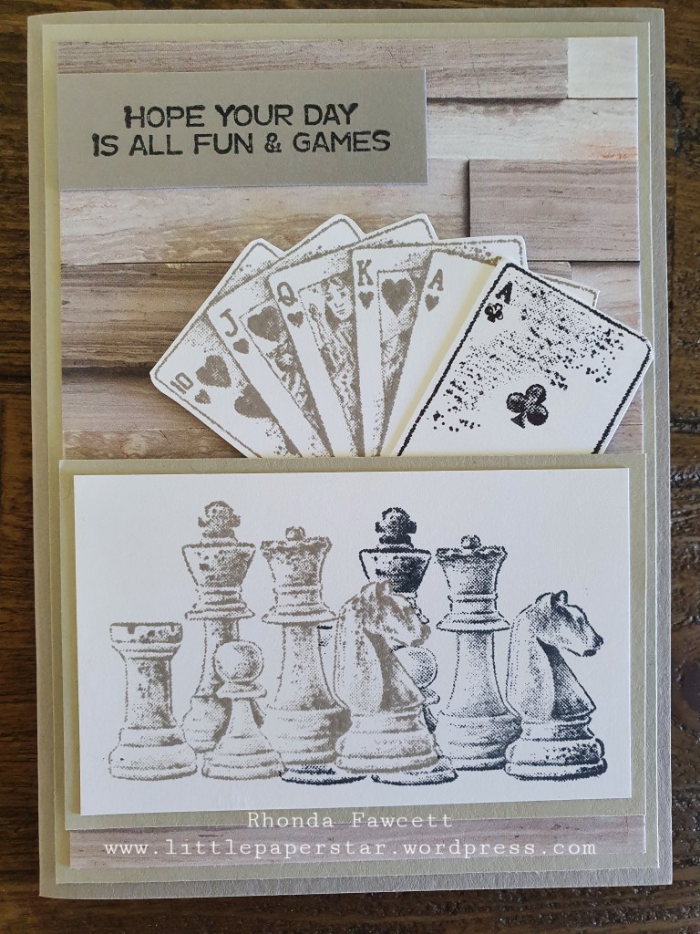 To make the chess pieces, I stamped the whole image first in Gray granite ink, then placed a mask over the top of the image and stamped again in memento black.