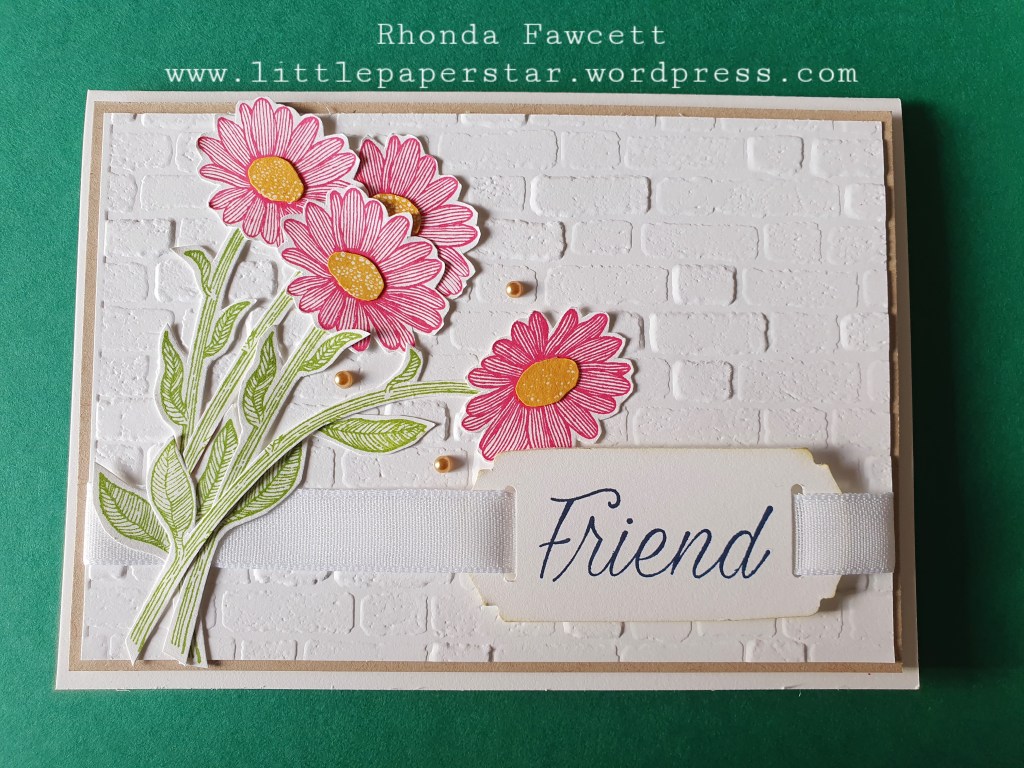 A simple friendship card, featuring the Daisy Lane stamp set and the Bricks and Mortar embossing folder. The ribbon is a soft faux linen ribbon from the flowers for every season combo pack. If you live in New Zealand and you want to purchase any of the products that you see here, please contact me.