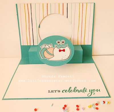 Pop Up Mechanism: Cut a strip of coloured card to match the front card colour to measure 10 cm x 8 cm. Score at 2.5, 5 and 7.5 cm. Fold along all score lines in the same direction.