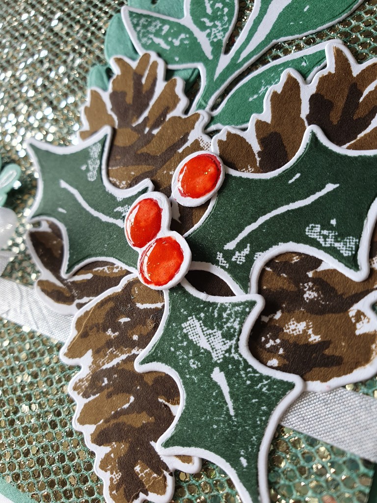 I added shine to the berries with fine tip glue. You have to start with just a small amount of glue and when it is dry, you can add a second layer. It will change the colour of the ink a little.