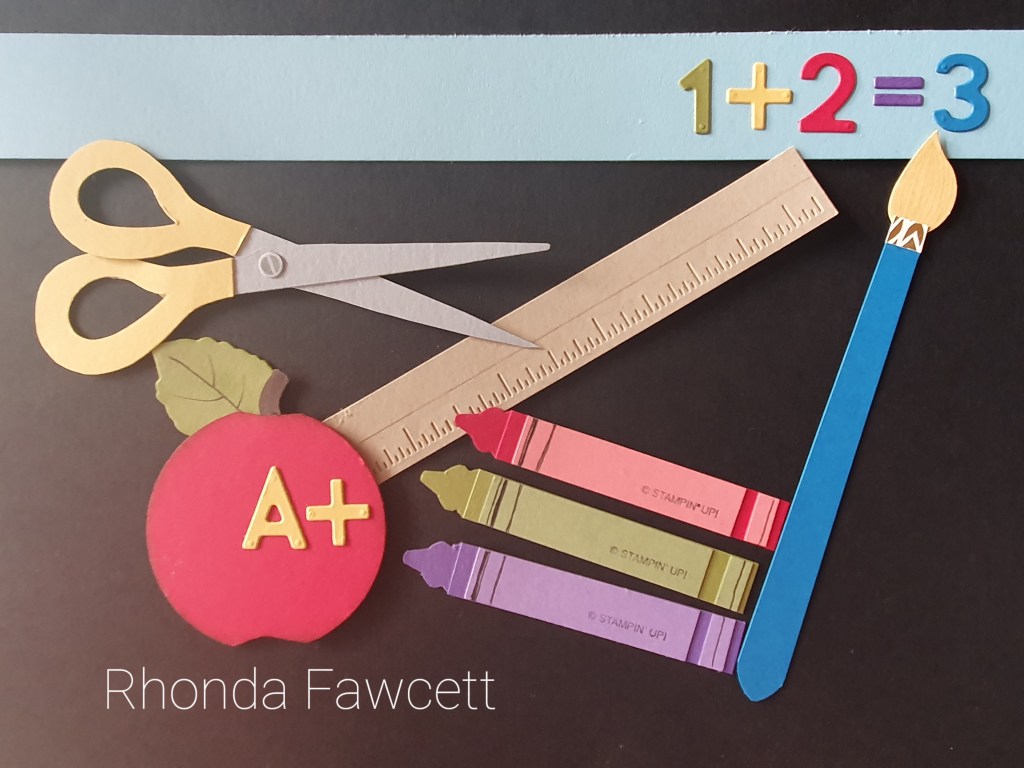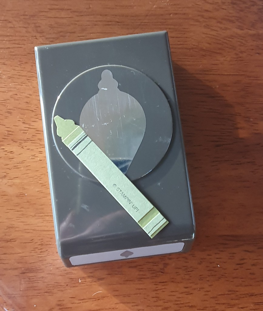 The paintbrush I handcut and then used a corner rounder punch to do the end. The top of the paintbrush is from the bird punch. The crayons are just a strip of card, measuring 7 x 1.2 cm. The top of the crayon is punched out using the top of one of the retired gleaming ornaments punch duo. Then I just trimmed a narrow slither of each side, so that it looked more like the tip of a crayon. The letter and numbers are from the Playful Alphabets dies.