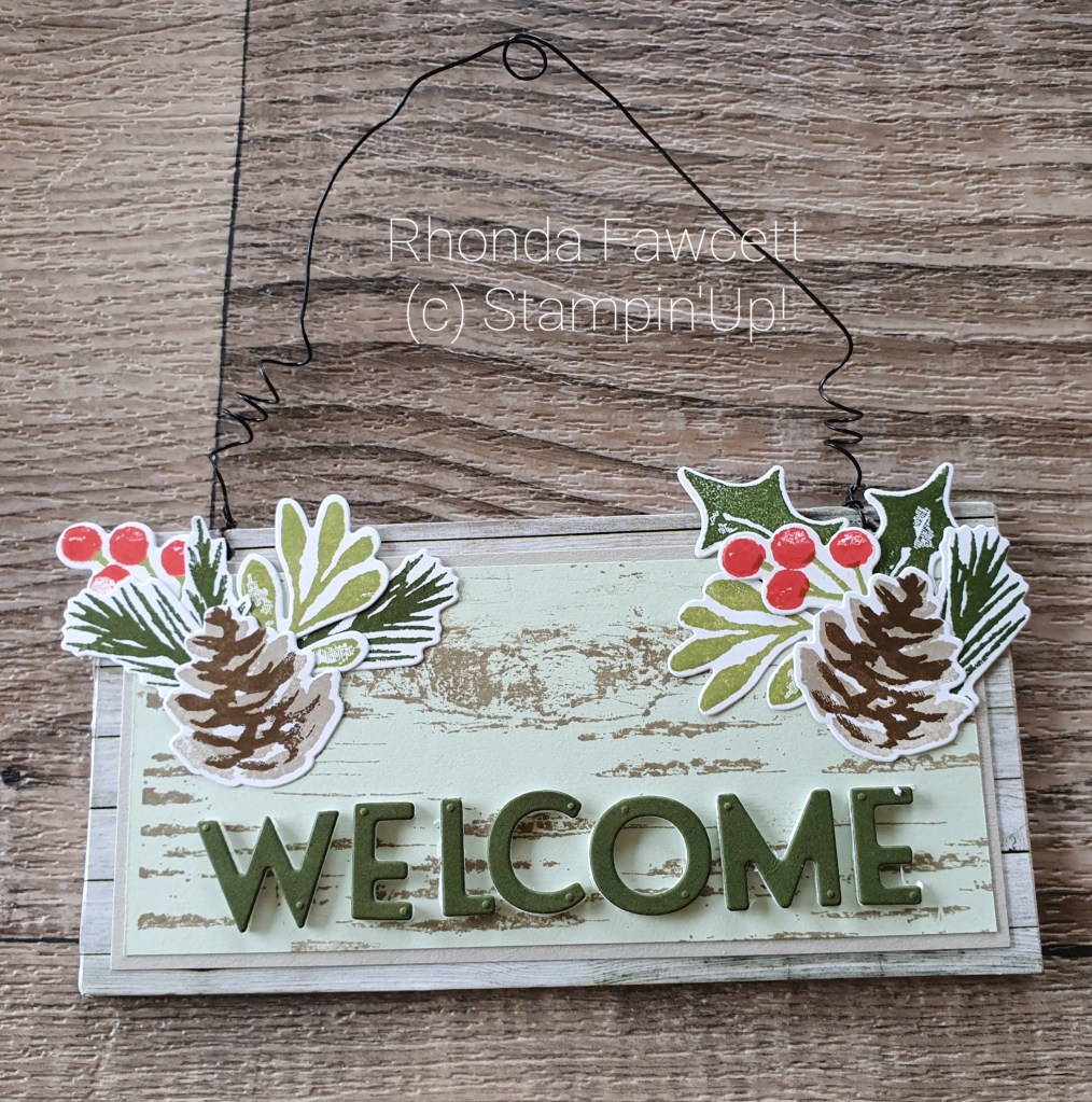 I found all these door hanging signs at a discount store. They had happy Christmas on in Grey felt and were very poorly glued on. I ripped off the felt and made my own decoration using the birch stamp on Soft Seafoam card.