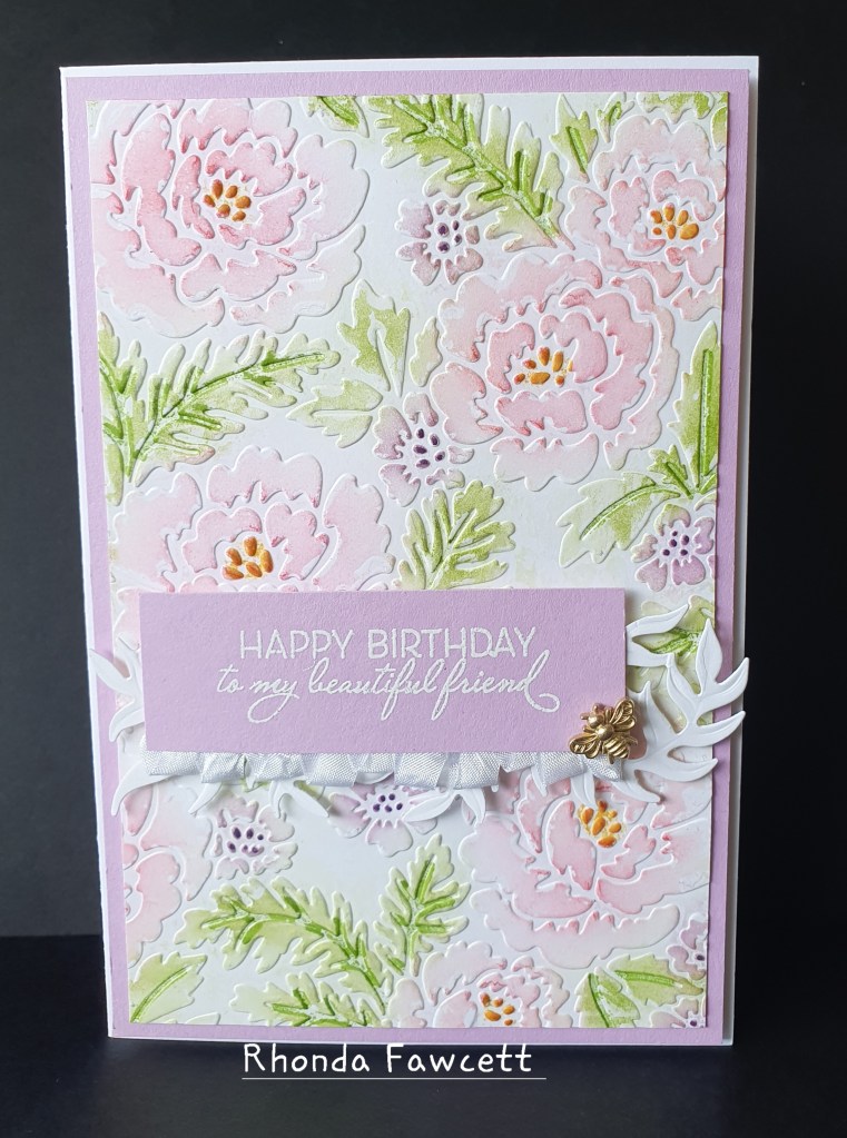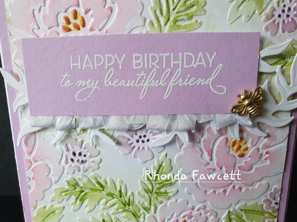 I had so much fun with my magnolia card that I decided to try it again with a different embossing folder. This time I used the Pretty Flowers embossing folder and coloured in the raised areas with ink and daubers. I used Flirty Flamingo, Granny Apple Green and Fresh Freesia.