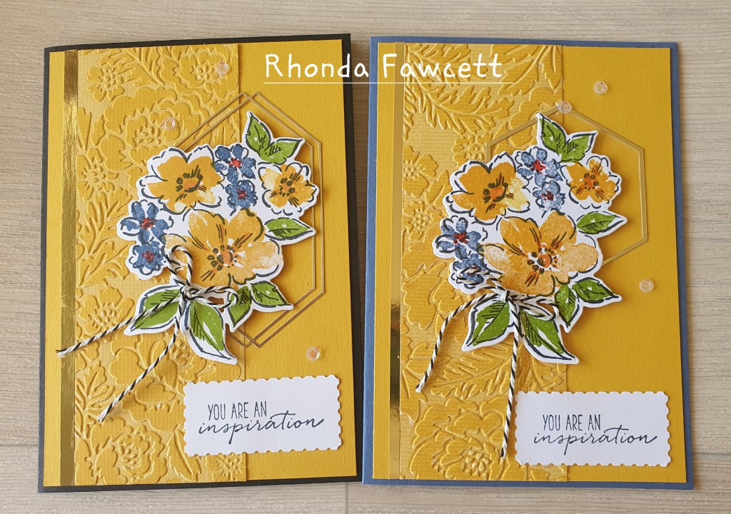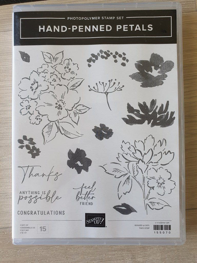 I just love this stamp set, Hand-Penned Petals. It is so easy to colour the flowers in as it is a two step stampin set but not one that you have to line up perfectly. It is meant to give a watercolor look, with a swipe of colour on the flowers and leaves. Colours I used were Memento black, Granny Apple Green, Crushed Curry and Misty Moonlight. I used Pumpkin Pie and Poppy Parade markers to colour in the flower centres. The pretty paper is a hostess reward paper and is called Pattern Party.