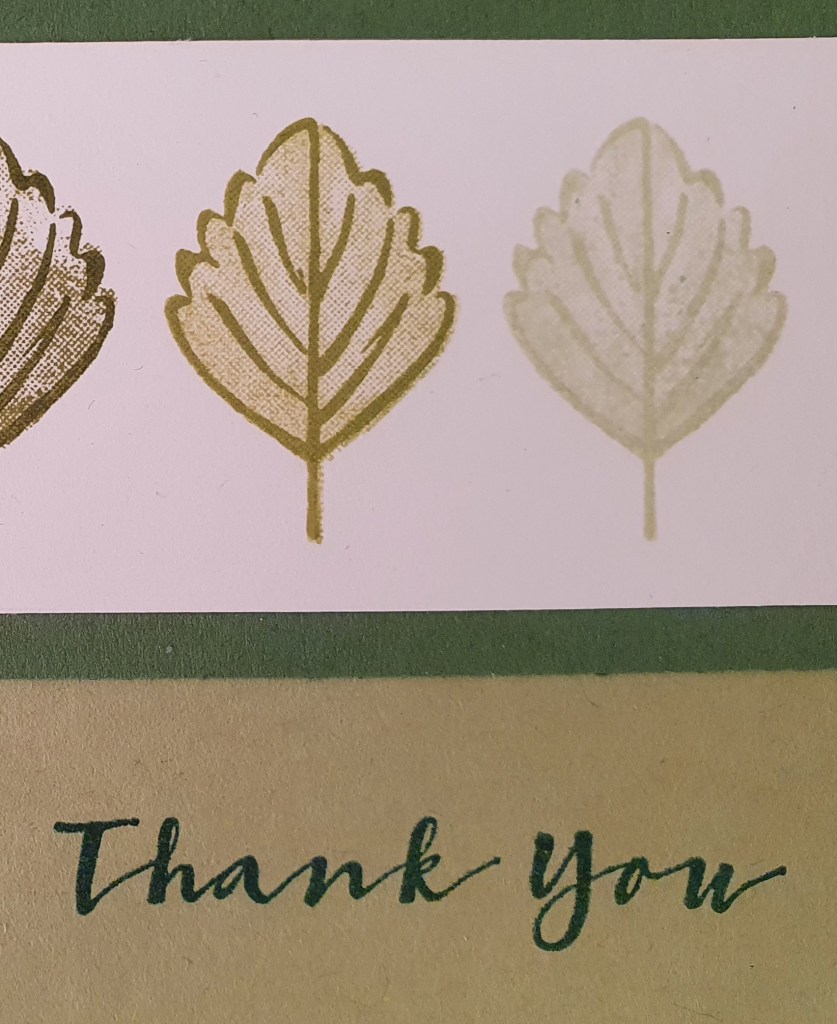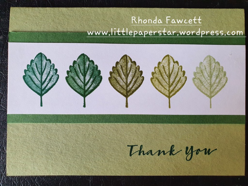 I mounted the strip of white card onto a 6 cm wide strip of Garden Green. Then I adhered that to a folded A5 Pear Pizzazz card. I stamped Thank you in Shaded Spruce ink.