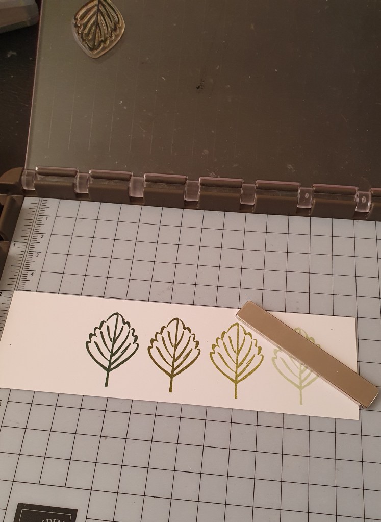 My first colour was Soft Seafoam. Then I moved the plate one hinge closer to the corner and stamped again with Pear Pizzazz. I didn’t need to clean the stamp in between inking as I was going from a lighter colour to a darker colour each time. The next colours were Old Olive, followed by Garden Green and finally Shaded Spruce.