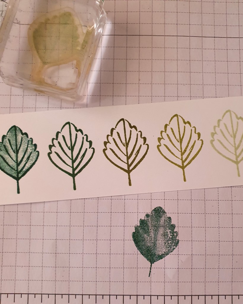 When I finished the row of leaves, I filled them in with another stamp from the same set. I used the corresponding ink colours to fill in each leaf with second generation stamping. (This is by stamping first on your scrap paper and second on the image). It gives a lighter shade by doing it this way and allows the veins of the leaves to still show clearly. I didn’t use the stamparatus for this as it is easy to line up with the photopolmer stamp.