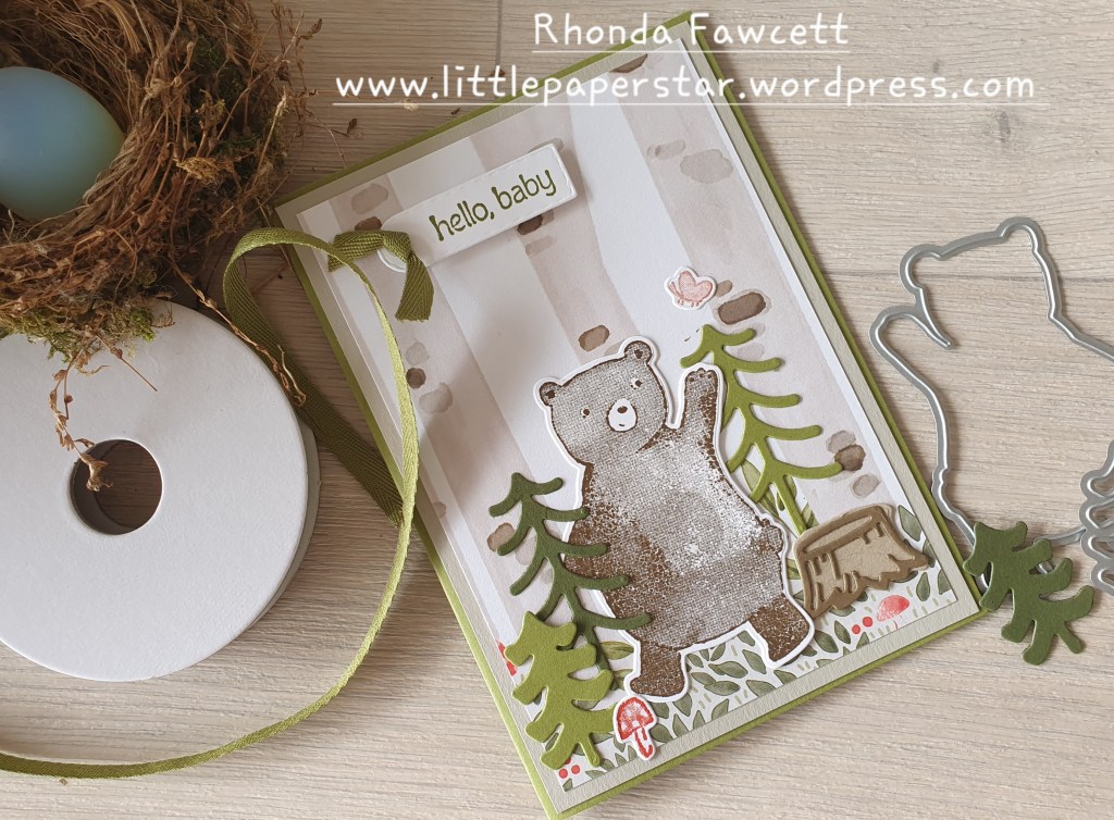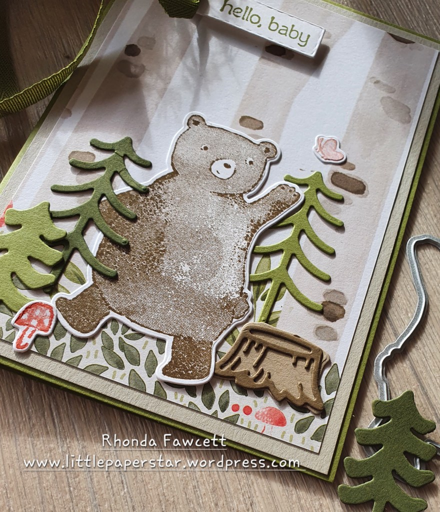 The bear is stamped and die cut out. The background is from the DSP (Designer Series Paper) pack, Happy Forest Friends. The ribbon is also from this suite and it is part of a 2 pack of lovely soft twill ribbon in both Old Olive and Sahara Sand.