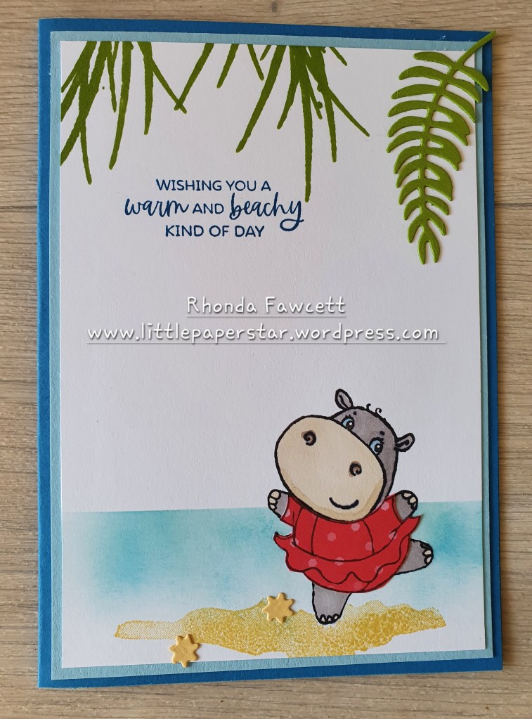 I used the Oceanfront stamp set to create sand and palm leaves. The sentiment is from the Paradise Palms stamp set. The little starfish dies are a free SAB (sale-a-bration) item with a qualifying purchase. It is part of the Hippo dies which contain 19 dies and not only cut out the hippo stamps but also have interesting shapes like sunglasses, water drops, snorkels, boat etc.