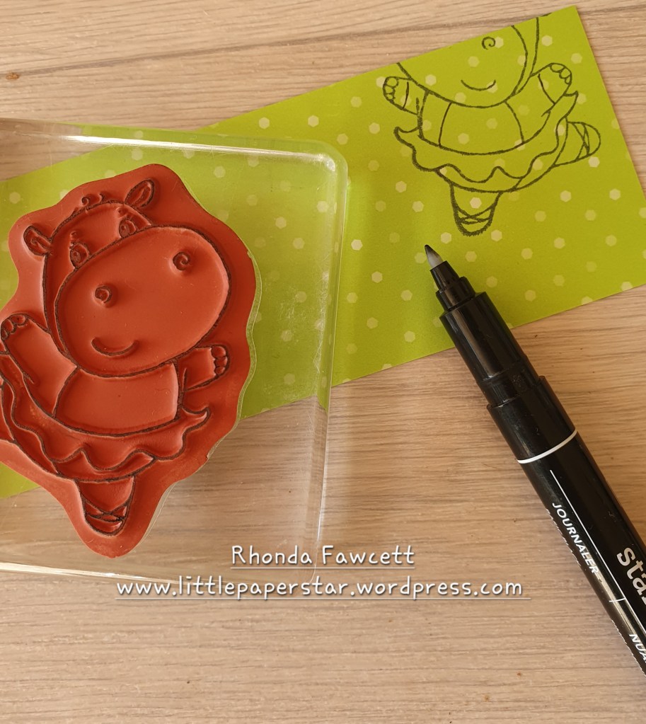 To make the swimsuit I stamped the hippo again on in colour paper and used a marker to draw in the sleeves and a extra panel down the tummy. I then fussy cut the swum suit out and glued it on top of the original stamped image on the card front.