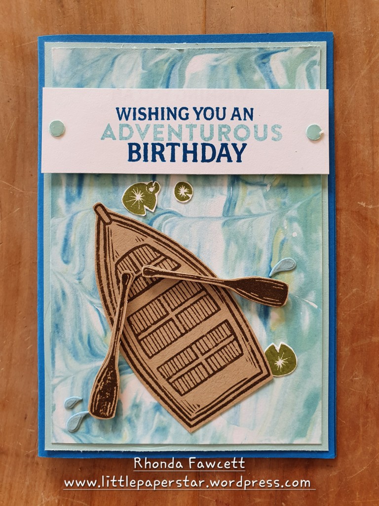 For this second card using the Adventurous Journey stamp set, I wanted to use the big rowboat image. 🚣♀️ Because the boat itself is very plain, I wanted to make a feature of the background. I used the shaving foam technique to do it.
