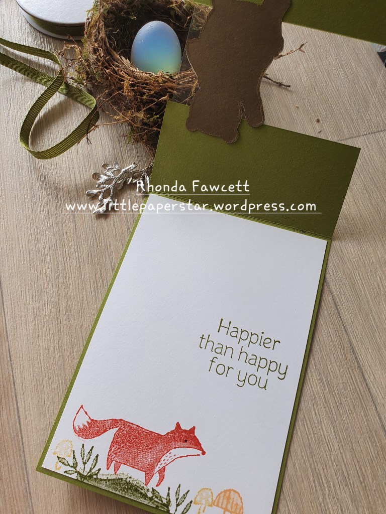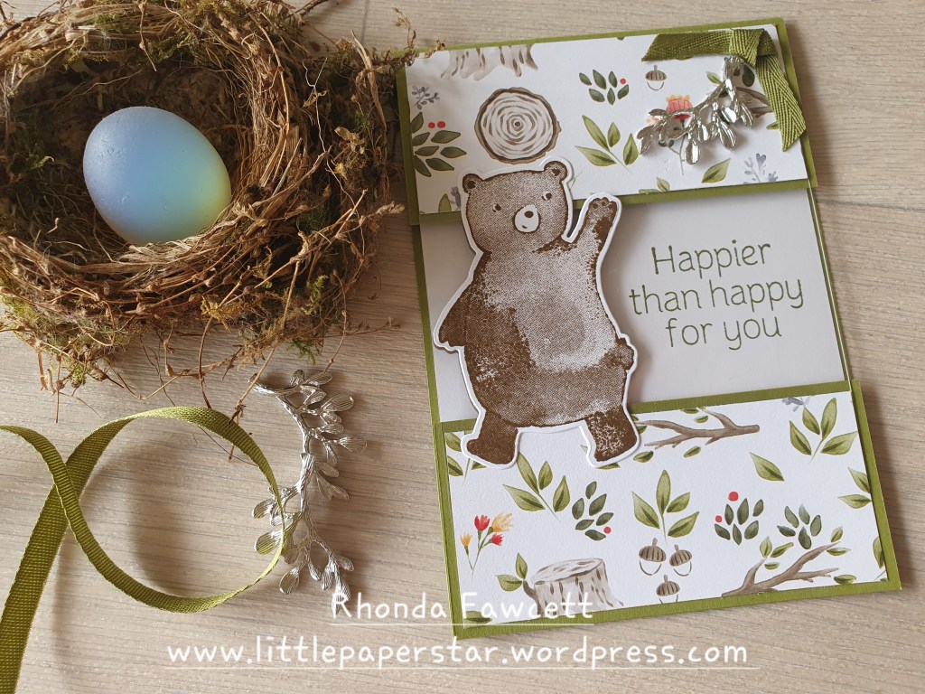 Decorate with the stamps and dies from the Happier than Happy bundle. Glue bear onto window sheet to the left hand side. Die cut a second bear shape from Soft Suede card and glue it on the underneath side of the window sheet to line up with the bear on the front. When you stamp the greeting inside, take care to position it so that it shows through the window at the side of the bear.