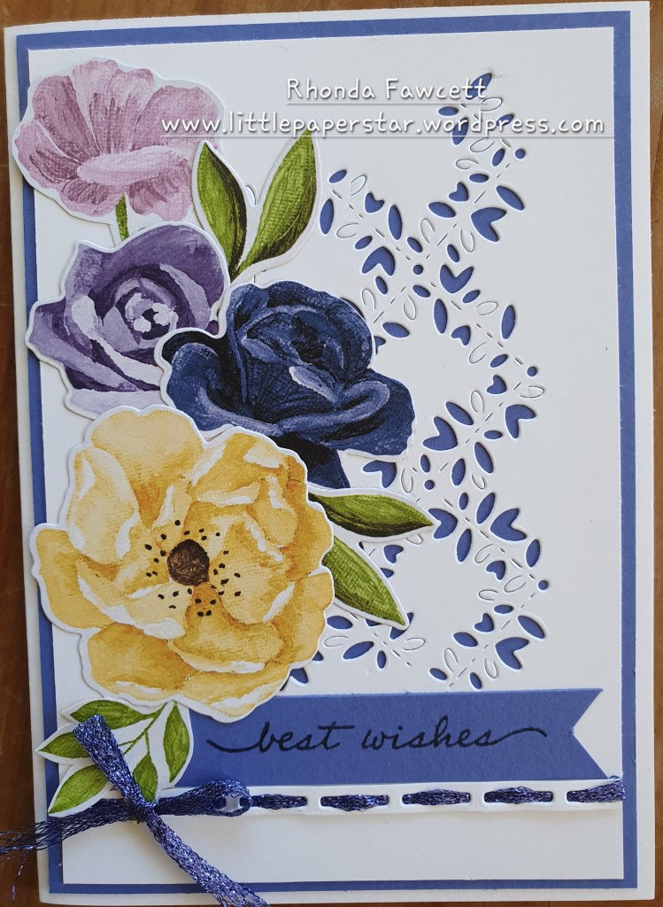 The “Hues of Happiness” bundle makes me happy. I love this pretty paper. It has so many flower images that you can either fussy or die-cut. The dies coordinate with the stamp and with the paper. So good!