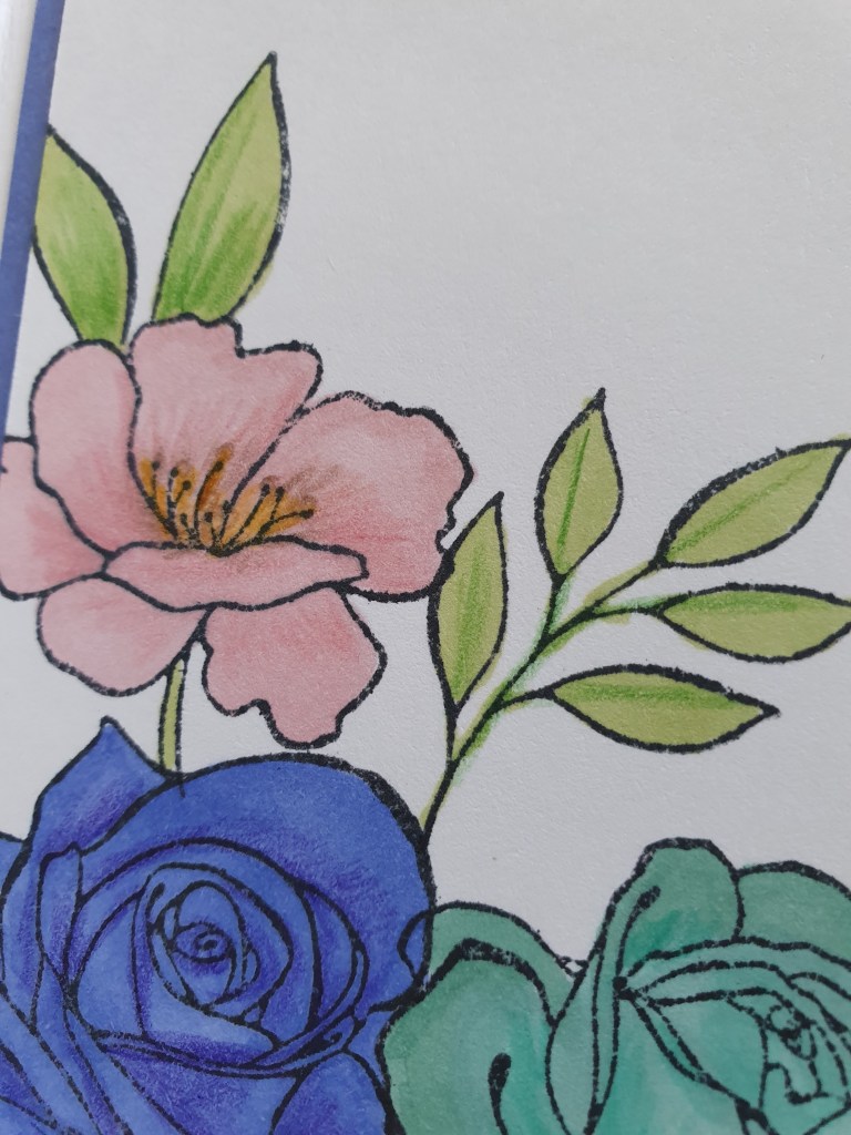 So far I have used the paper to make more than 35 cards with average of 4 flowers on each card and I still have more flowers left to use. This is a recent class project. We stamped flowers inside the card to match those on the outside and coloured them with Blends and watercolor pencils.