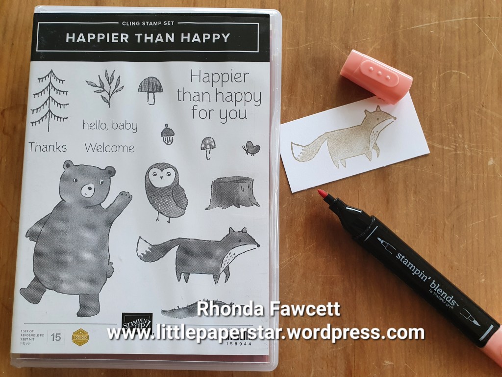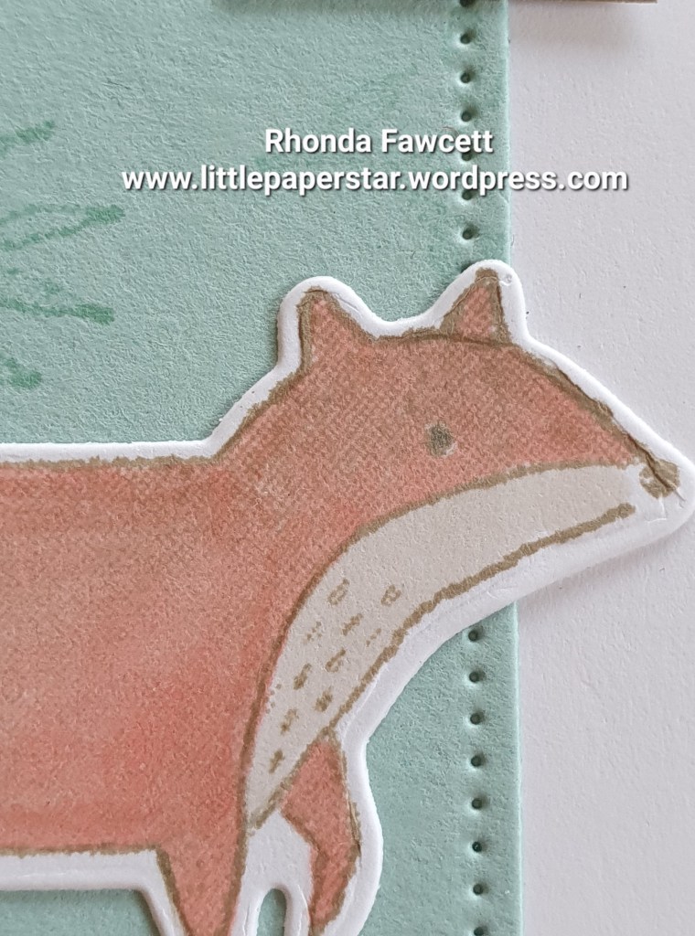 It worked out well. You could still see hints of the Sahara Sand ink through the Blend colouring. It lends a nice soft look to this baby card which is exactly what I wanted. The alternative would have been to stamp the fox in Calypso Coral ink and I feel it would have been too much orange for this card. I used a Gray Granite marker pen to dot in the eye, just so it stood out a little more.