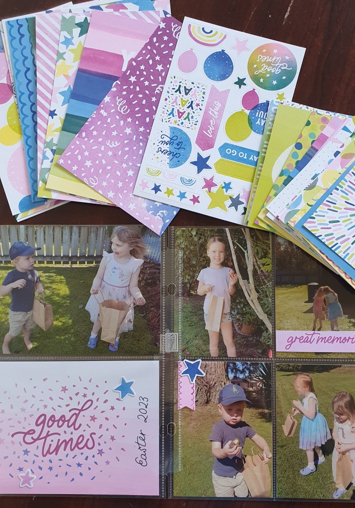 I was excited to get my hands on this new card and sticker pack. It’s the only item in the catalogue that has come down in price. I love the bright and happy colours. They would work well for any party celebration photos. I used them for an Easter egg hunt layout.