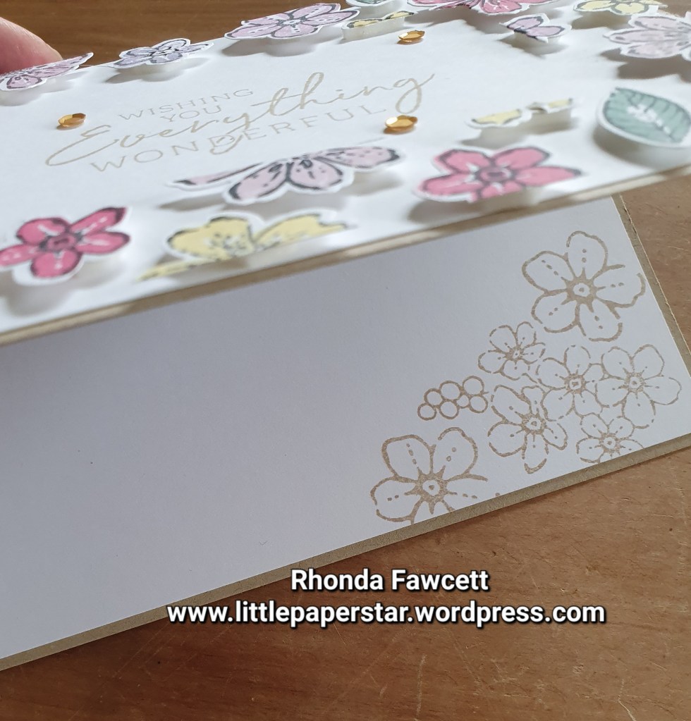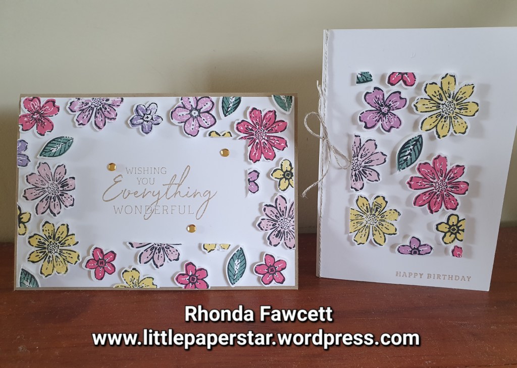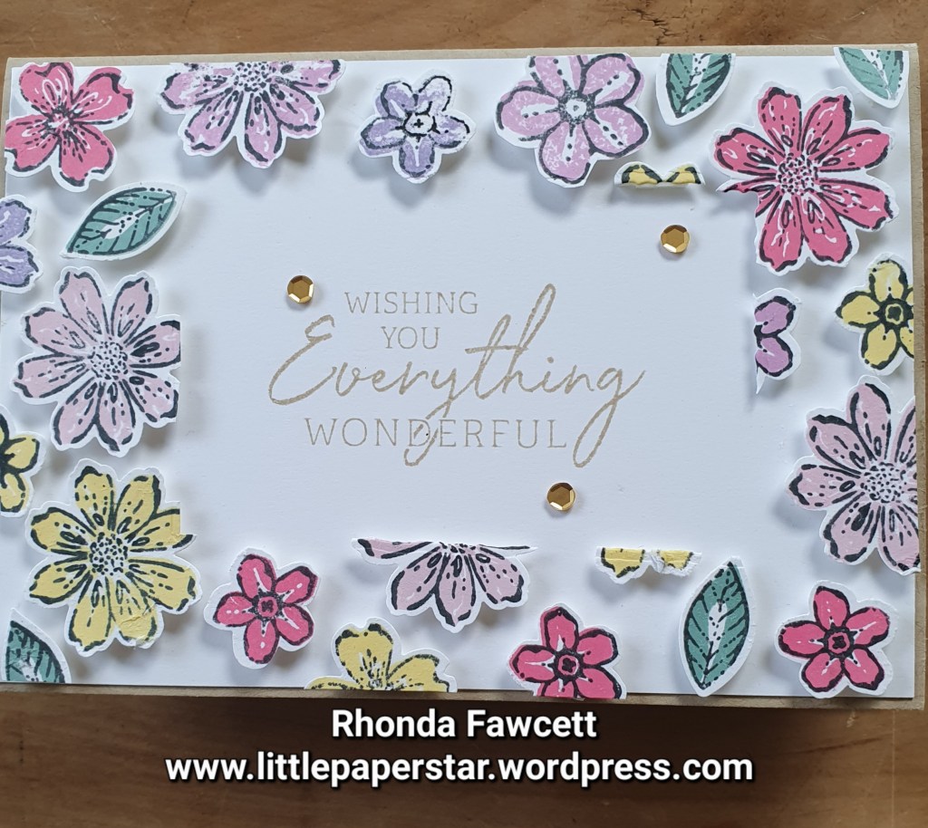 This week I have been making Floating Frame cards. To make these cards you lay out lots of little stamped and punched images like these flowers from the Petal Park bundle. I used Press and Seal cling wrap from GLAD ®️.It holds all the pieces in place while you cut out the frame. Then you need to adhere foam dimensionals to the back of each piece before adhering to your card.
