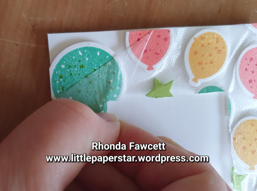 Repeat the process with the rectangle that you removed at the beginning. Adhere dimensionals to the back of all the pieces on the rectangle shape. Then adhere to a small gift card base. Peel off cling film. Add a sentiment and stamp a couple of small balloons inside.