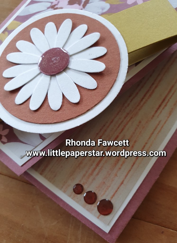 I didn’t have the coordinating Cheerful Daisy dies so I used a retired Daisy punch instead as the focal piece on my belly band. I used in colour glossy dots embellishments and emulated the look on the centre of my daisy flower, using Wink of Stella and Fine Tip Glue.
