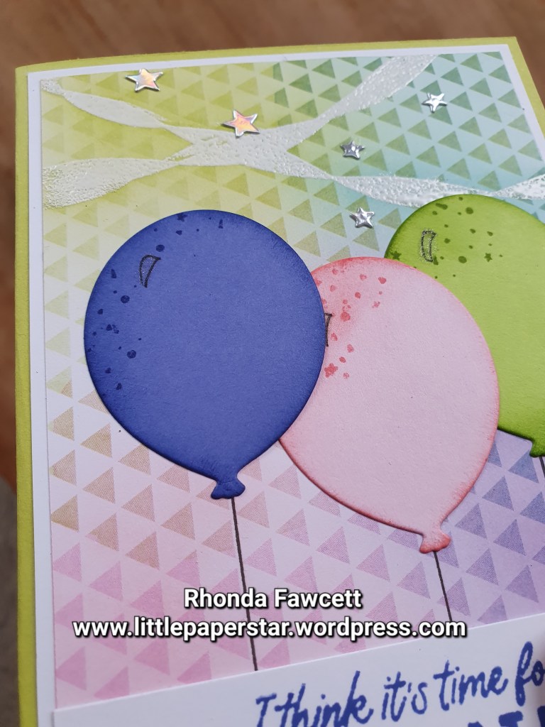 Then I added the balloons and the greeting. I hand drew in the balloon string with a ruler and Stampin’ Write marker.