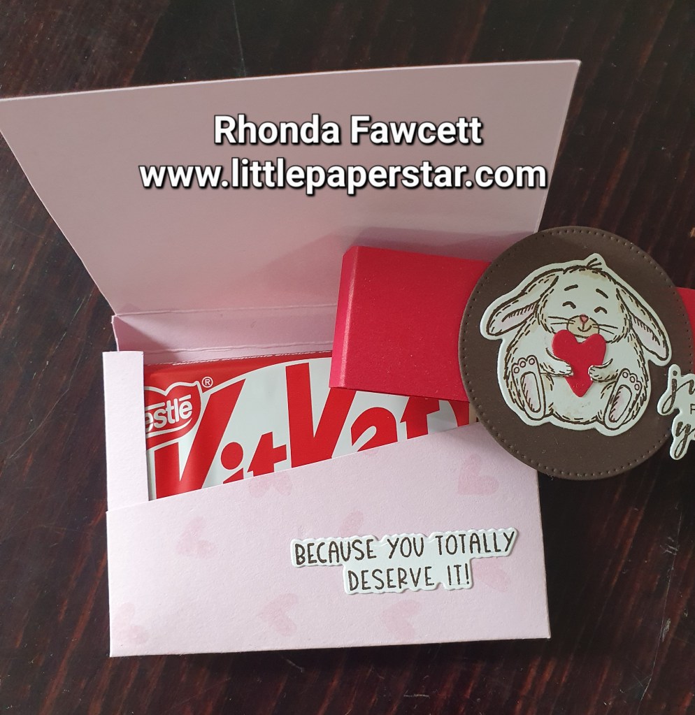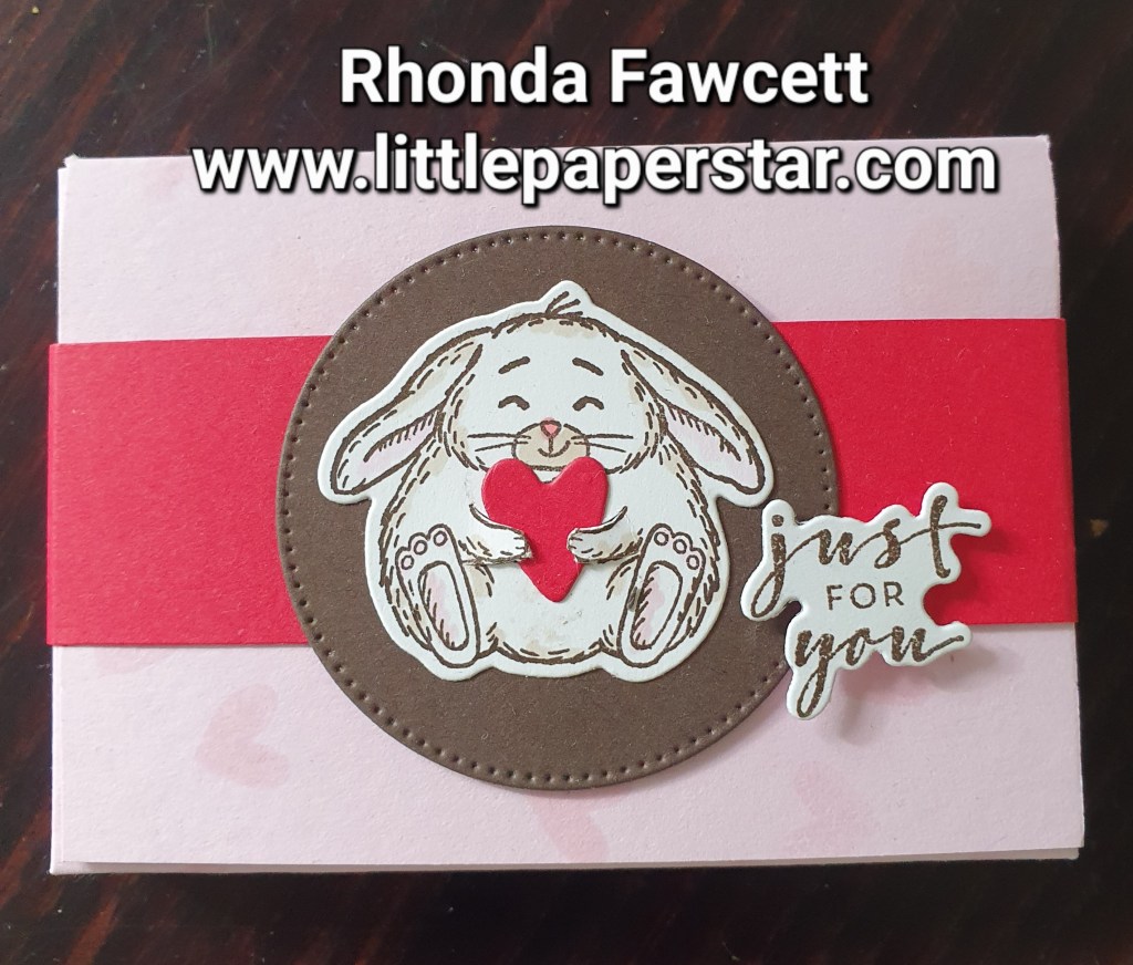 They use the Fluffiest Friends stamp set (for the rabbit), the Bee my Valentine stamp set (for the little heart stamped randomly over the box) and the Charming Sentiments bundle.