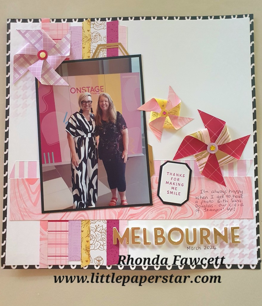 The paper is from the recently retired, “Most Adored” pack from Stampin’ Up! I loved the white gold foil designs on this pack. The reverse side was mostly pinks and reds but the white and gold side can be sponged with any colour to match your page colours. I used a blending brush to sponge on Lemon Lolly colour to one of the pinwheels and one of the strips. I added some strips of card stock (Fresh Freesia and Berry Burst) to bring in more colours from the photo.