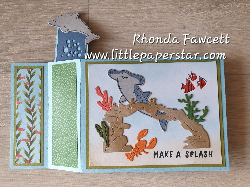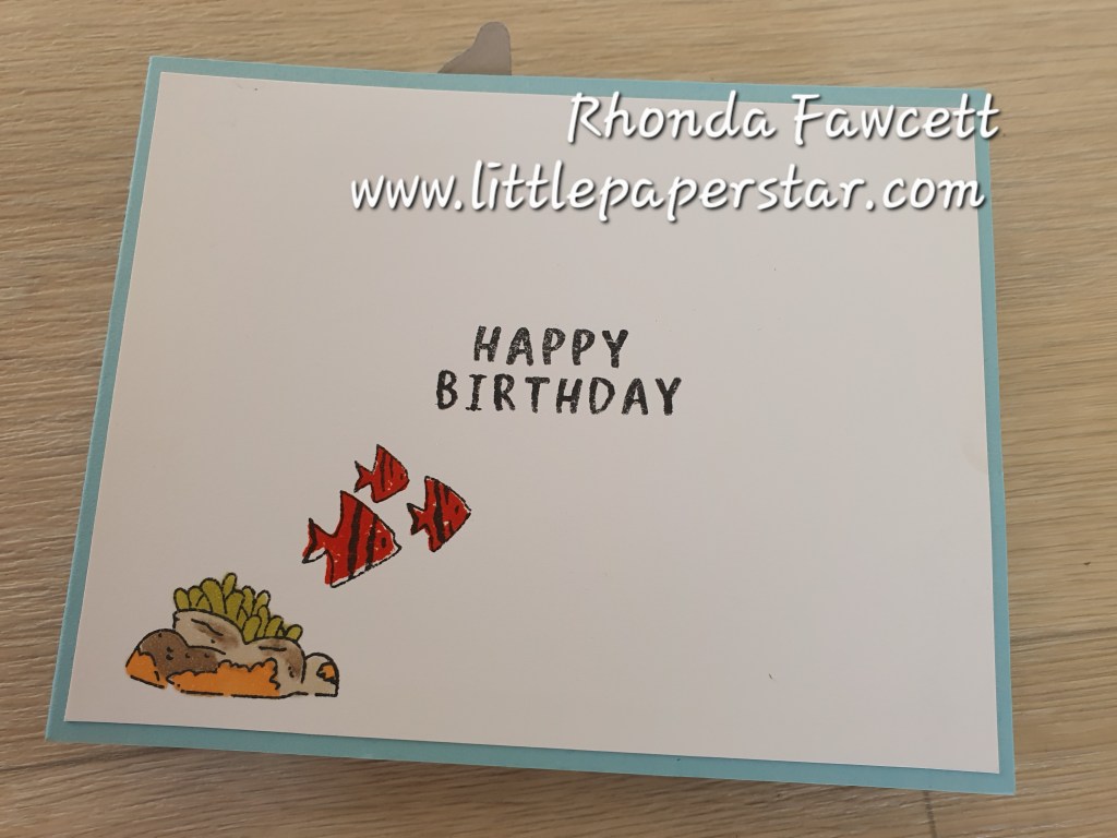 It uses the Friendly Fins bundle, which has many fish images including some I haven’t used like a happy stingray. I also stamped the back of the card.