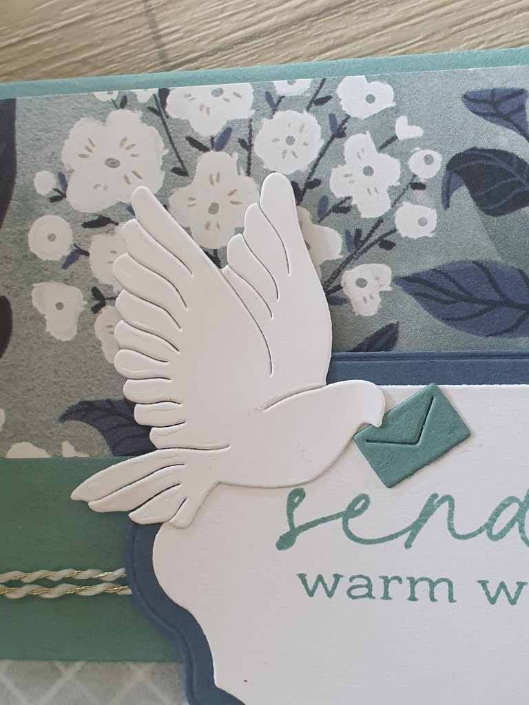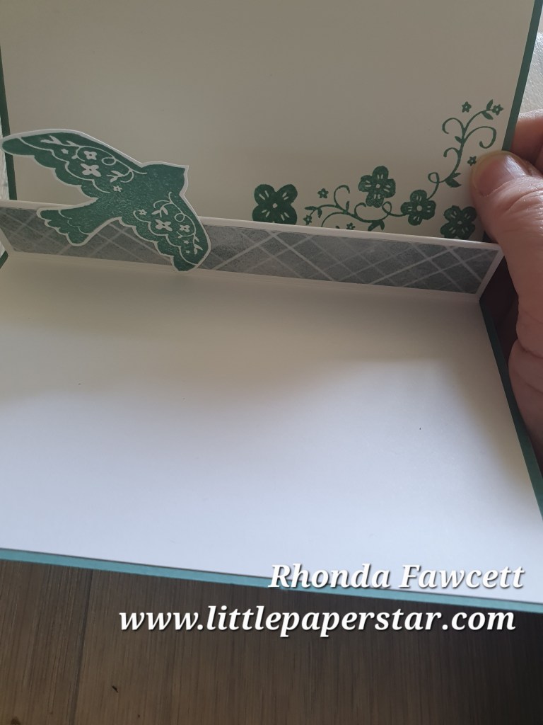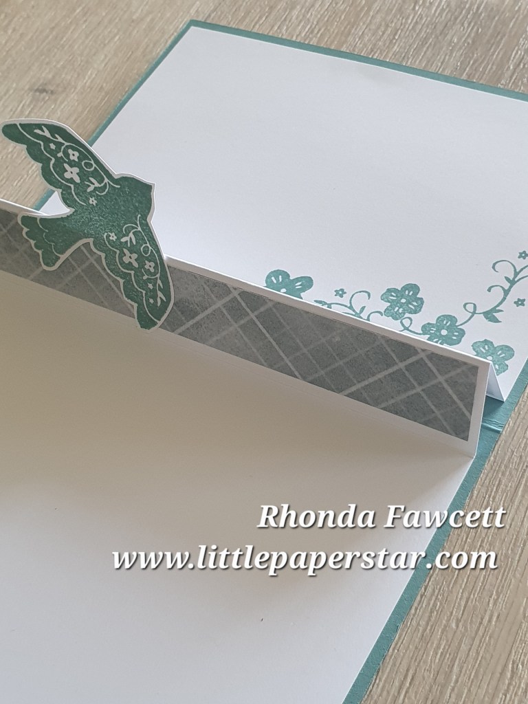 I glued on a stamped dove from the Peaceful Days stamp set to the pop up middle .