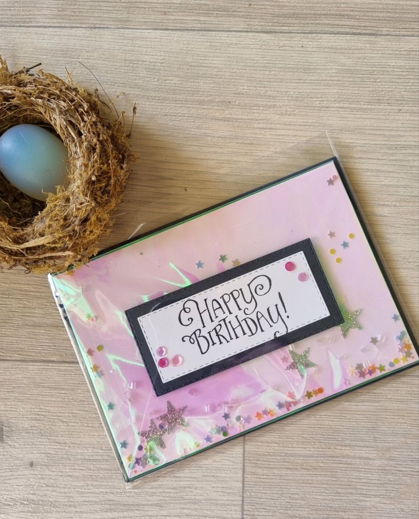 3) Shaker cards: Another way to use the Iridescent Treat Bags is to make a simple Shaker card. This card was cased from Lynsay Mahon. I placed a 10 cm x 14.4 cm piece of white card inside the Iridescent Treat Bag , then added sprinkles before taping it closed. I did have to fold over one edge to make sure it was tight around the vanilla card. I then taped this to my night of navy card front. And finally added a greeting to the front.