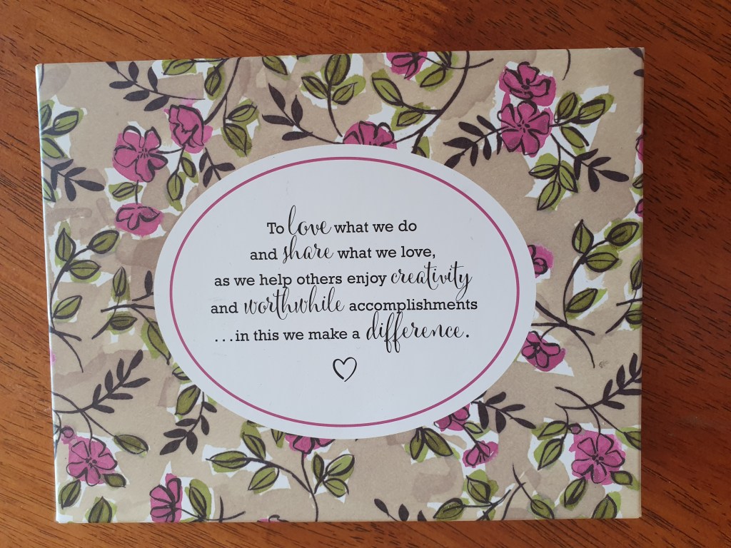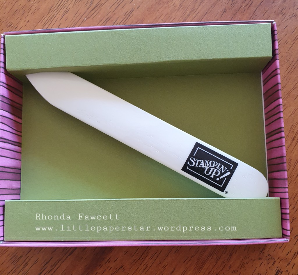This gorgeous gift box was originally purchased full of embellishments (Share what you love embellishment kit), but it was much too pretty to throw away when i had finished with it and I loved how it had Stampin” Up!’s statement of the heart written on the lid. So I made a liner for it to hold a bone folder that I had printed with the recipient’s name as a gift.